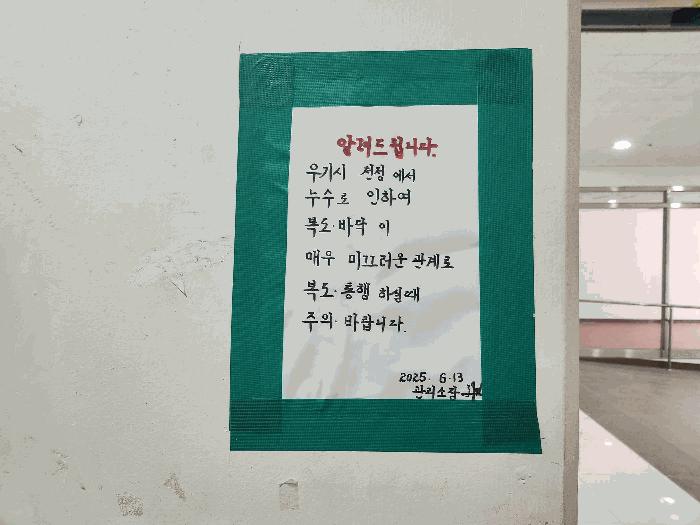 - º»°Ç ¼ÒÀç °Ç¹° 1Ãþ õÀå ÀϺΰ¡ ÆÄ¼ÕµÇ¾î ÀÖ°í, º®¿¡ '¿ì±â½Ã ´©¼ö ¾Ë¸²'ÀÌ ºÎÂøµÇ¾î ÀÖÀ½(°¨Á¤Æò°¡¼ ÂüÁ¶) ¡Ø¹Ì³³°ü¸®ºñ(°ø¿ë) Àμö¿©ºÎ¸¦ ÀÔÂû Àü¿¡ È®ÀÎÇϽñ⠹ٶø´Ï´Ù